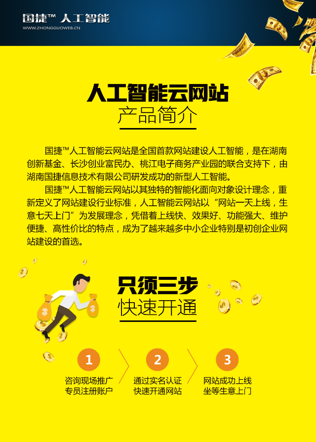 国捷人工智能云网站由湖南国捷信息技术有限公司主导研发,多级政府部门提供政策、场地和资金支持。作为全球首款细分行业人工智能,国捷人工智能将让网站建设行业迎来更高层次的用户体验,同时将为中国上千万中小企业带来全新的智能网站和营销方式。面对这样一个美好的世界,一种全新的人工智能生活方式,我们将全力以赴。让我们携手,开启一个全新的人工智能生活方式!