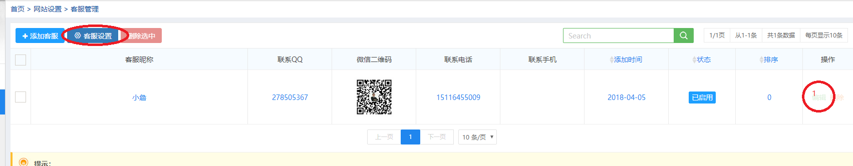 2、如上图,个人微信二维码就点操作那编辑,进入修改页面管理即可,添加客服道理亦同。如果是显示网站首页最下面的微信公众号的二维码,请在客服设置页面中管理。